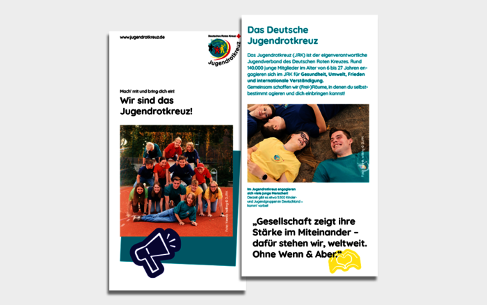 Der aktuelle Imageflyer des JRK im Format Din lang, gibt mit kurzen Texten und passenden Bildern einen allgemeinen Überblick über die wichtigsten Themen und Aktivitäten des Jugendrotkreuzes. Er ist thematisch allgemein gehalten und spricht so mehrere Zielgruppen des JRK an: die breite Öffentlichkeit ebenso wie Eltern, Lehrkräfte und junge Menschen. Der Flyer eignet sich deshalb hervorragend als Beilage für Pressemappen, als Info-Material bei Veranstaltungen und als Auslage in den Verbandsräumen.